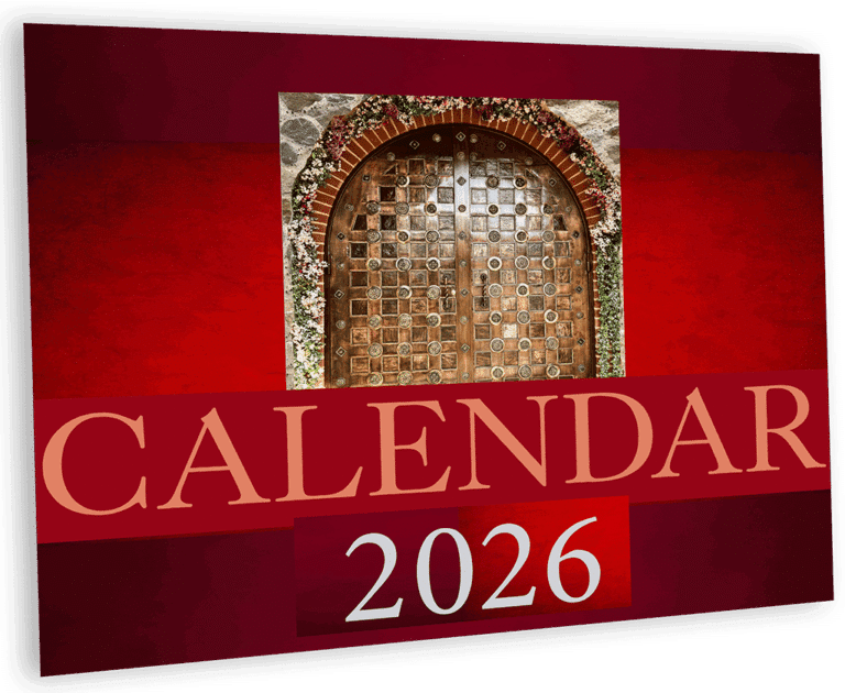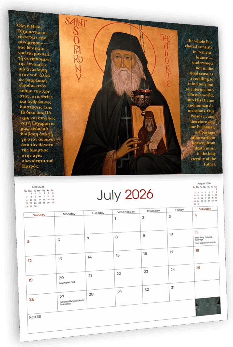 Our 2026 wall calendar adorned with photos from our newly built church dedicated to Saint Sophrony the Athonite alongside extracts from the book The House of our Father.