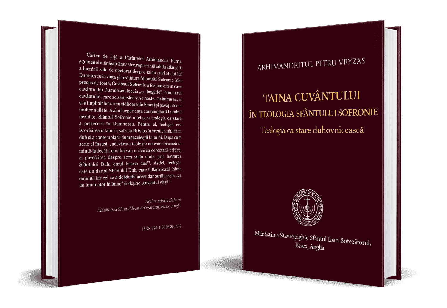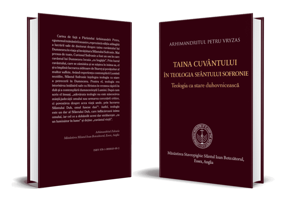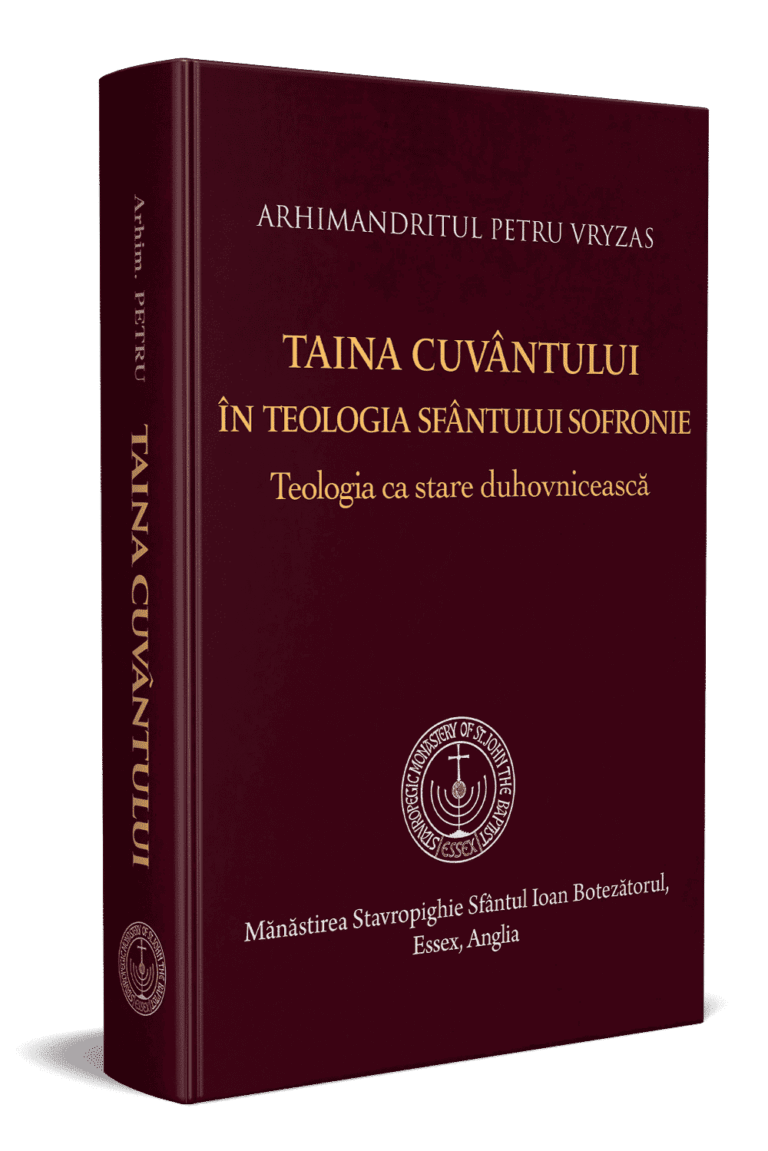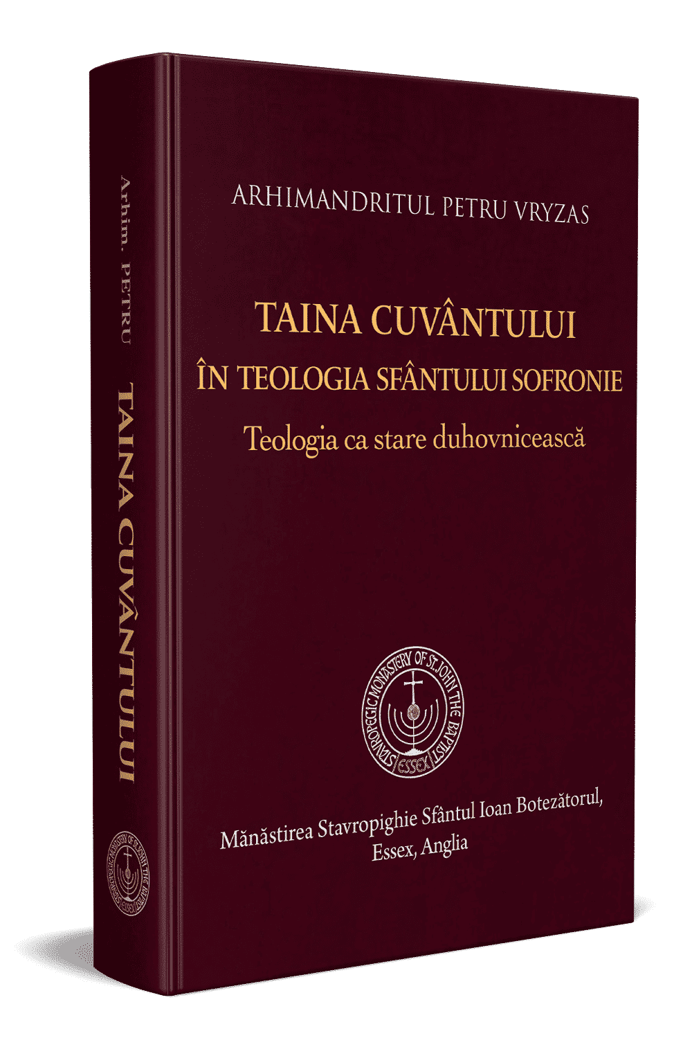 Cartea de față a Părintelui Arhimandrit Petru, egumenul mănăstirii noastre, reprezintă ediția adăugită a lucrării sale de doctorat despre taina cuvântului lui Dumnezeu în viața și învățătura Sfântului Sofronie. Mai presus de toate, Cuviosul Sofronie a fost un om în care cuvântul lui Dumnezeu locuia „cu bogăție”. Prin harul cuvântului, care se zămislea și se năștea în inima sa, el și-a împlinit lucrarea ziditoare de Stareț și povățuitor al multor suflete. Având experiența contemplării Luminii nezidite, Sfântul Sofronie înțelegea teologia ca stare a petrecerii în Dumnezeu. Pentru el, teologia era istorisirea întâlnirii sale cu Hristos în vremea răpirii în duh și a contemplării dumnezeieștii Lumini. După cum scrie el însuși, „adevărata teologie nu este născocirea minții-judecății omului sau urmarea cercetării critice, ci povestirea despre acea viață unde, prin lucrarea Sfântului Duh, omul fusese dus”. Astfel, teologia este un dar al Sfântului Duh, care înflăcărează inima omului, iar cel ce a dobândit acest dar strălucește „ca un luminător în lume” și deține „cuvântul vieții”.